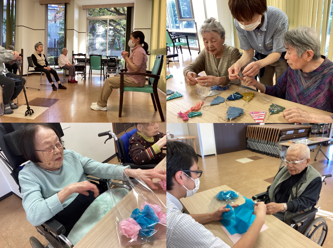 ミニデイを担当するのは基本違うユニットで働くケアワーカーたちです。月初めにみんなで集合し何を行うかを話し合いをします。皆入居者様に楽しんでいただきたく色んなアイディアが盛りだくさん!!人によっては数か月前から入居者様に作ってもらう作品を自分で作ってみたり、下準備に取り掛かるなんて話を聞いたりすることもありますね。皆それぞれ一生懸命です。本当に話し合いの場から自分の思ってもみなかった、考えも浮かばなかったことばかりあって毎回とてもに勉強になる事ばかりなんですよ☻