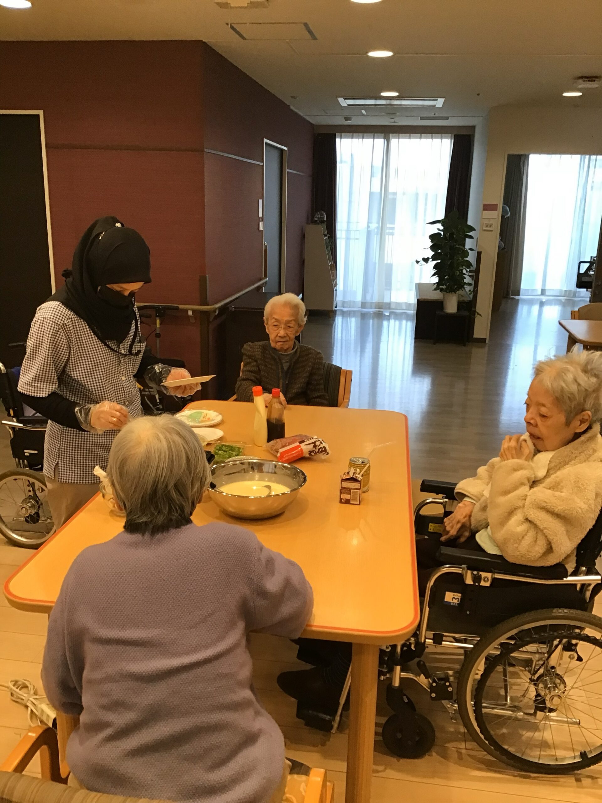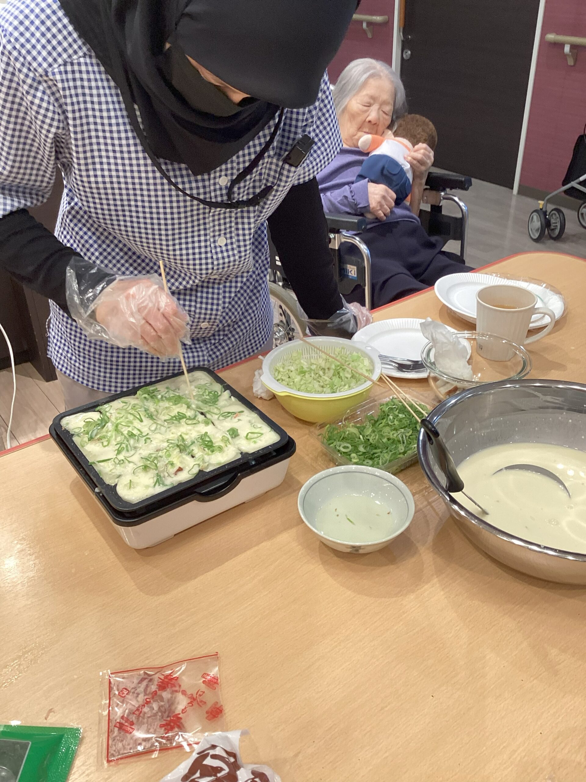 私が働いている日本の介護施設で、入居者様と一緒にたこ焼きを作るレクリエーションを行いました。職員と入居者様が努力しながら生地を流し、たこ焼きをくるくる回して作りました。