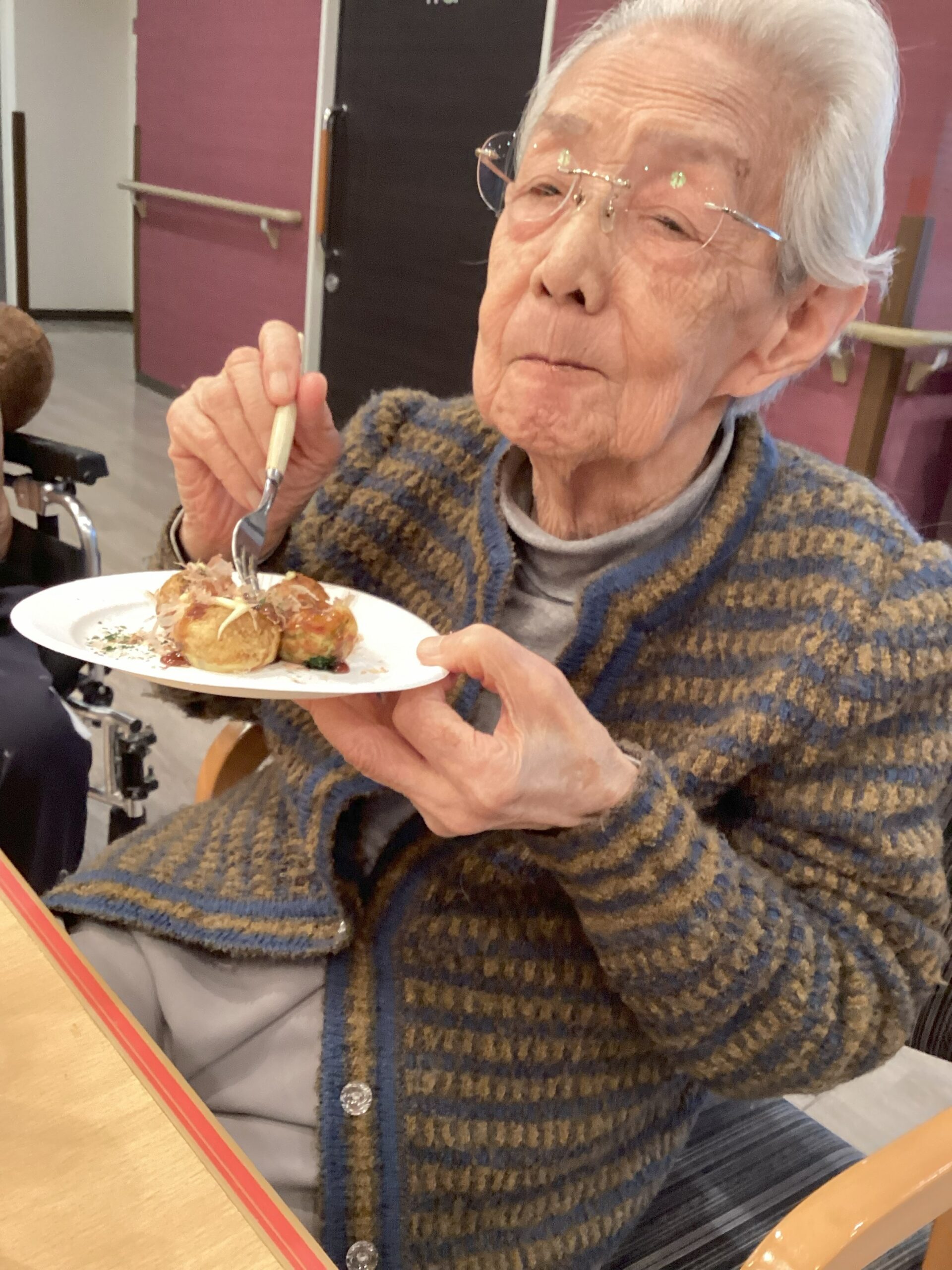 完成たこ焼きを食べる時間になると、入居者様はたくさん召し上がり、「とても美味しい」、「もっと食べたい」と笑顔で話して下さいました。たこ焼きはたくさん食べて「おいしい」と言っていただけたことで、私の心もとても温かくなり、本当に幸せな気持ちになりました。みんなで作り、みんなで食べるたこ焼きは心まで満たしてくれる特別な時間でした。入居者様の笑顔を見ることができ、改めてこの仕事のやりがいを感じていました。